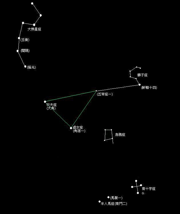 南十字座-春夏夜裏瞬現的美麗星座,全天八十八個星座之中最小的一個。可以觀測到的時間是每年的四到六月,凌晨十一時至翌晨一時。是臺灣可以觀測到最南端的一個星座,只能在墾丁,或南部的高山無光害地區才能偶然一見,可謂難得。 我們先找到最為人熟知的「大熊星座」(北斗七星),沿著尾端的玉衡、開陽、搖光三顆星所形成的弧線一直延伸,會連續碰到兩顆一等星「牧夫座」的大角星、「處女座」的角宿一,繼續往南延伸就會遇到「烏鴉座」四邊形;烏鴉座的南方地平線(海平線)上就會看到一個很小很美的十字架,最大亮度的 α 星有 0.6 等,但是也最靠近海平面。 23:30 9 Apr. to 1:00 10 Apr. 「獅子座」五帝座一、大角、角宿一則形成春季大三角 在希臘神話中,這隻烏鴉是太陽神 Apollo 送給美女 Coronis 的禮物,擁有雪白亮麗的羽白,這隻烏鴉不但學會說人類的語言,還學會了喋喋不休、搬弄事非的本事。 一日烏鴉看見 Coronis 在和男士聊天,因而將其所見加油添醋地告訴 Apollo, Apollo 妒火之下一箭射向皇宮,沒想到不偏不倚地射中 Coronis 的胸口;Coronis 此時已懷有 Apollo 的孩子,臨死之前用盡最後一口氣把孩子產下。Apollo 知道自己犯下了大錯,未經查證就輕信烏鴉,害死了自己的愛人,差點也害死自己的孩子。悲憤之餘不但將烏鴉說話的能力拿掉,還把烏鴉一身雪白的羽毛變成了黑色,放逐天界。 這或許是「烏鴉嘴」、「天下烏鴉一般黑」的由來?